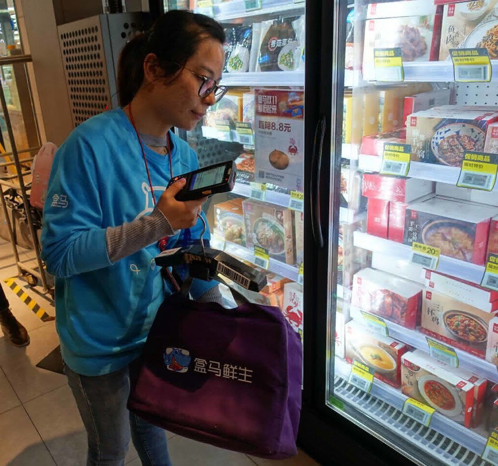 消費者下單後,店員就要開始忙碌了:盒馬鮮生店內的店員--「盒馬小哥」(不論男女喔XD)從手中POS機接到電子訂單後,就忙著拿「撿貨包」穿梭在超市裡備貨,接著將準備好的撿貨包配送出去。 因此,你可以將比較難以攜帶或很重的商品(生鮮啊,酒啊,牛奶啊)選擇讓物流配送回家,30分鐘內確保可以取得商品。 Photo Credit:INSIDE