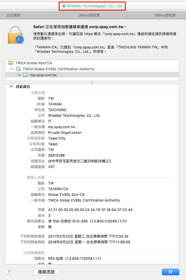 【註一】啟用EV SSL的網站在網址列會出現綠色的公司名稱,意即該網站經過完整認證,消費者可從憑證內容看到完整公司資料,不用擔心詐騙。