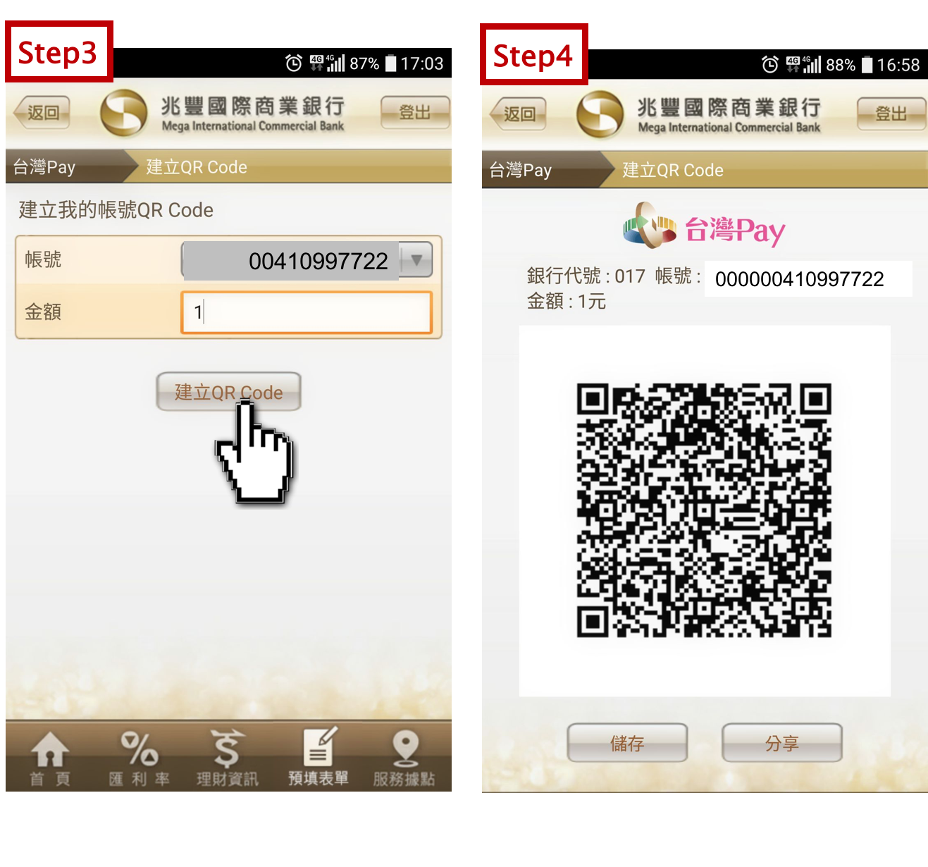 Step6:對方用台灣Pay或網銀開啟掃碼器,掃描你的QRcode後就會自動帶入你的銀行代碼和帳號,對方輸入要支付的金額,接續完成付款動作(此處以兆豐網銀APP為例)即付款完成