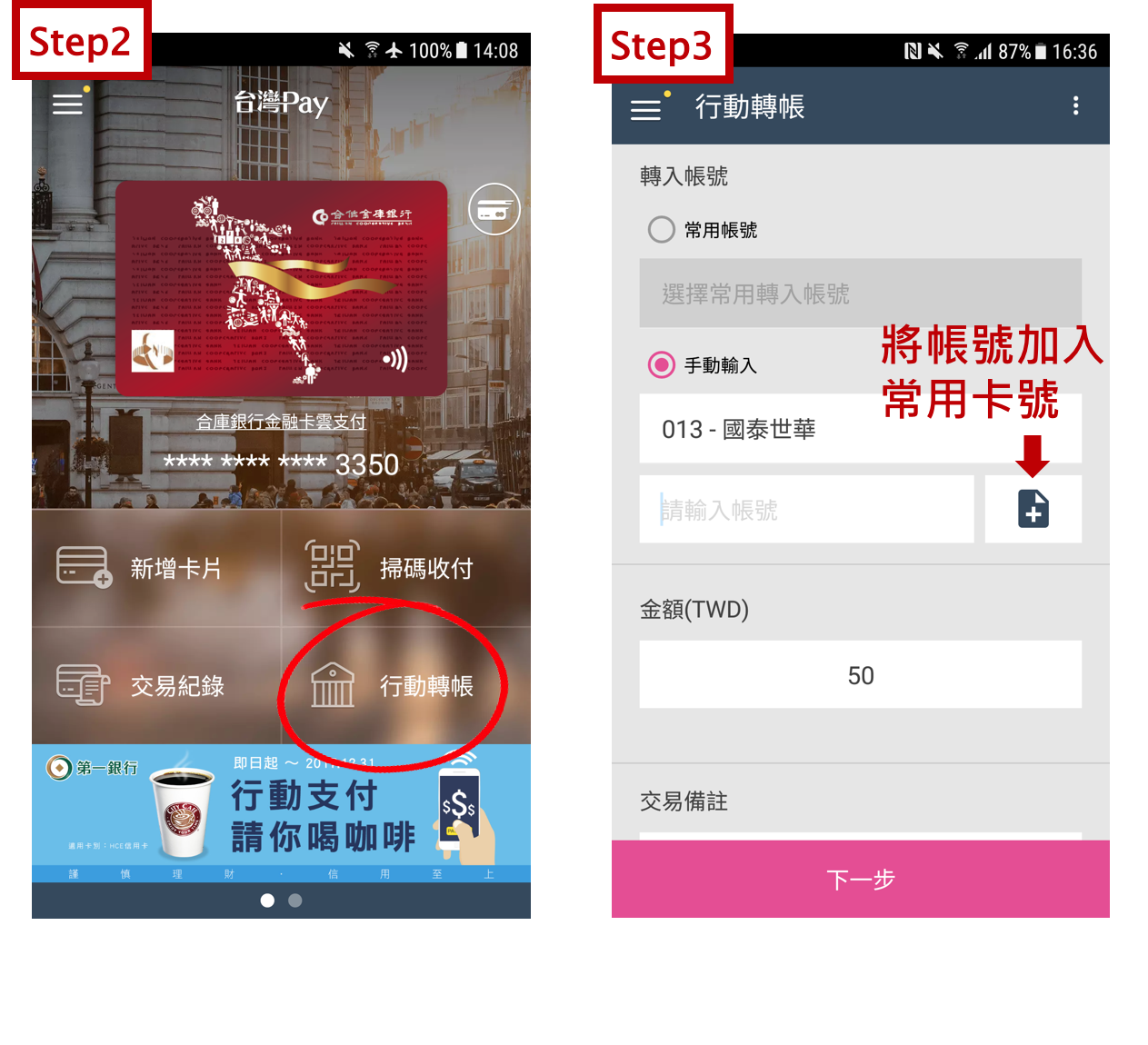 Step3:選擇常用帳號,或手動輸入帳號,接著輸入金額