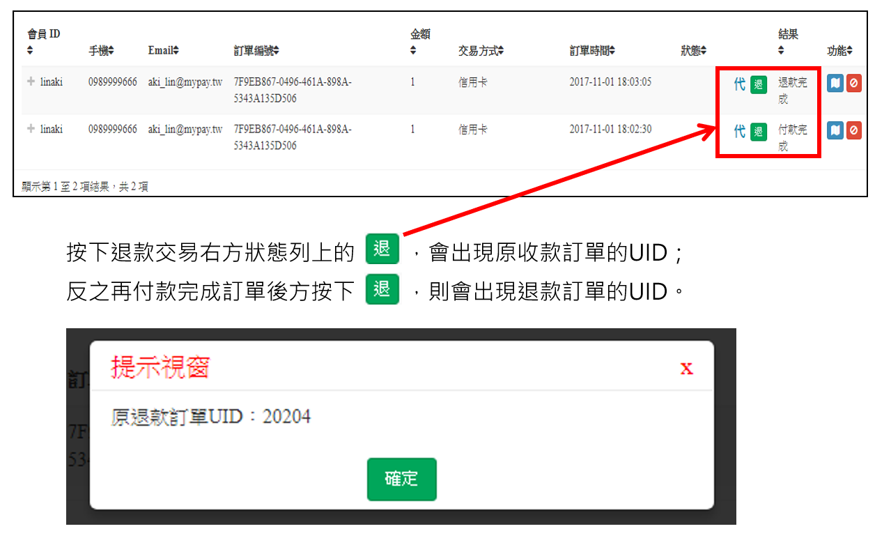 故退款完成後,系統會產生另一筆相同訂單編號的退款交易但UID會不同,查詢該筆訂單就會有一筆收款一筆退款的紀錄。