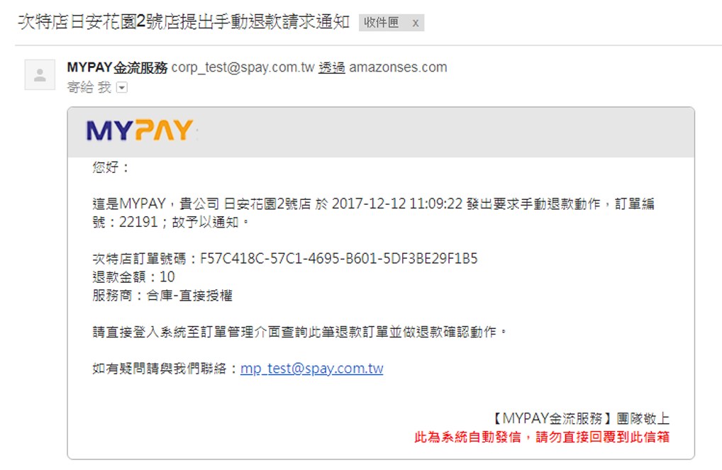 說明:當完成手動退款申請之後,MYPAY或銀行特店模式店家的負責人員會收到MAIL通知,
