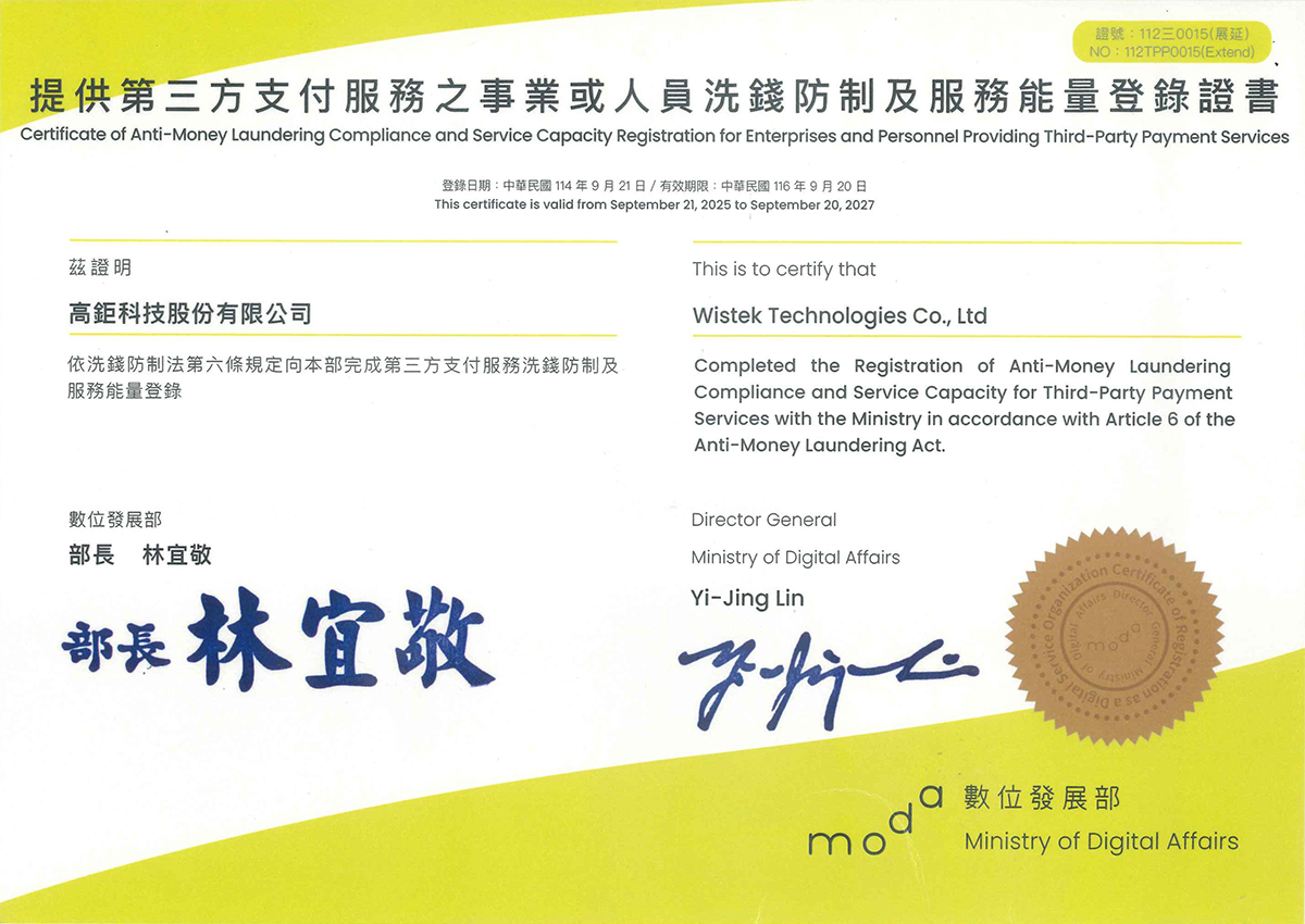 為了滿足客戶需求,我們也取得第三方支付相關認證:數發部第三方支付服務洗錢防制及服務能量登錄,與同時也取得 VISA 與 Master 認證支付服務業者(Payment Serevice Provider)。