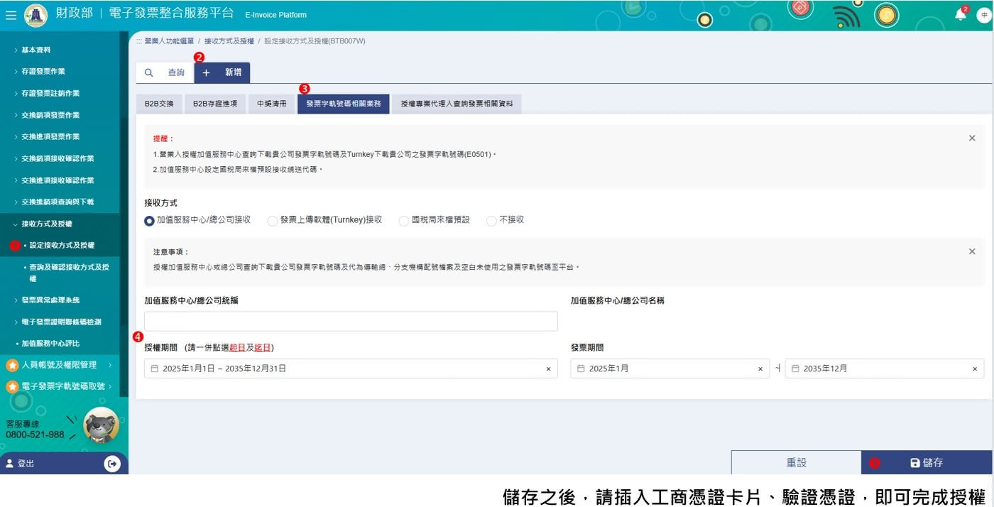 (1) 接收方式及授權→設定接收方式及授權→新增→發票字軌號碼相關業務