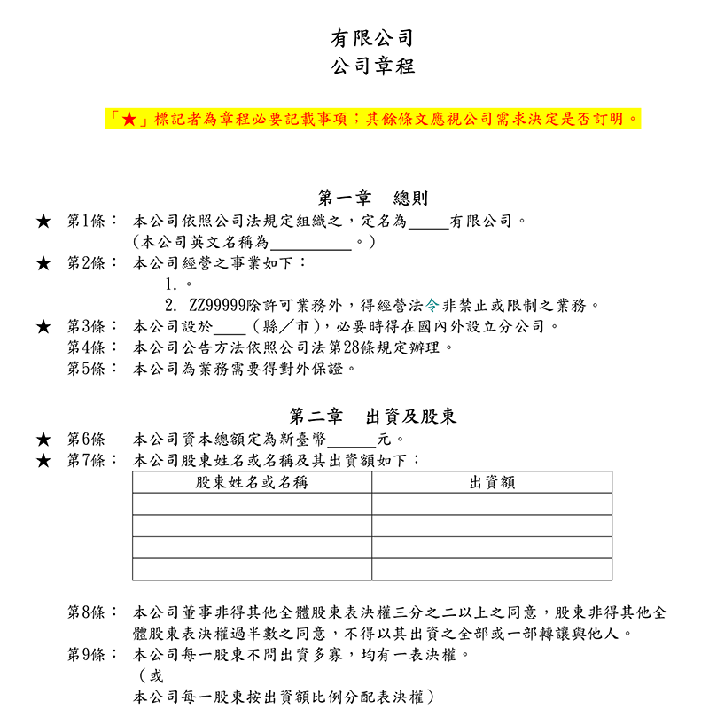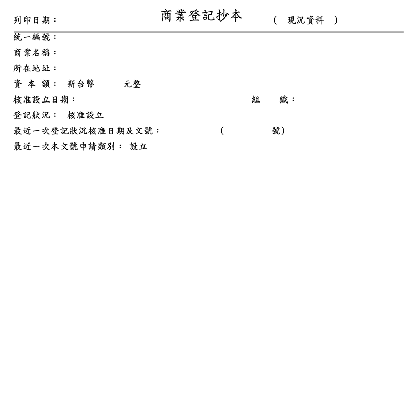 - 設立(或變更)登記表/公司章程/商業登記抄本:需載明董監事(股東)資料及出資額或持有股份數。若公司登記表董監事名單含有法人出資額 25% 以上,應再提供下一層股權資訊。