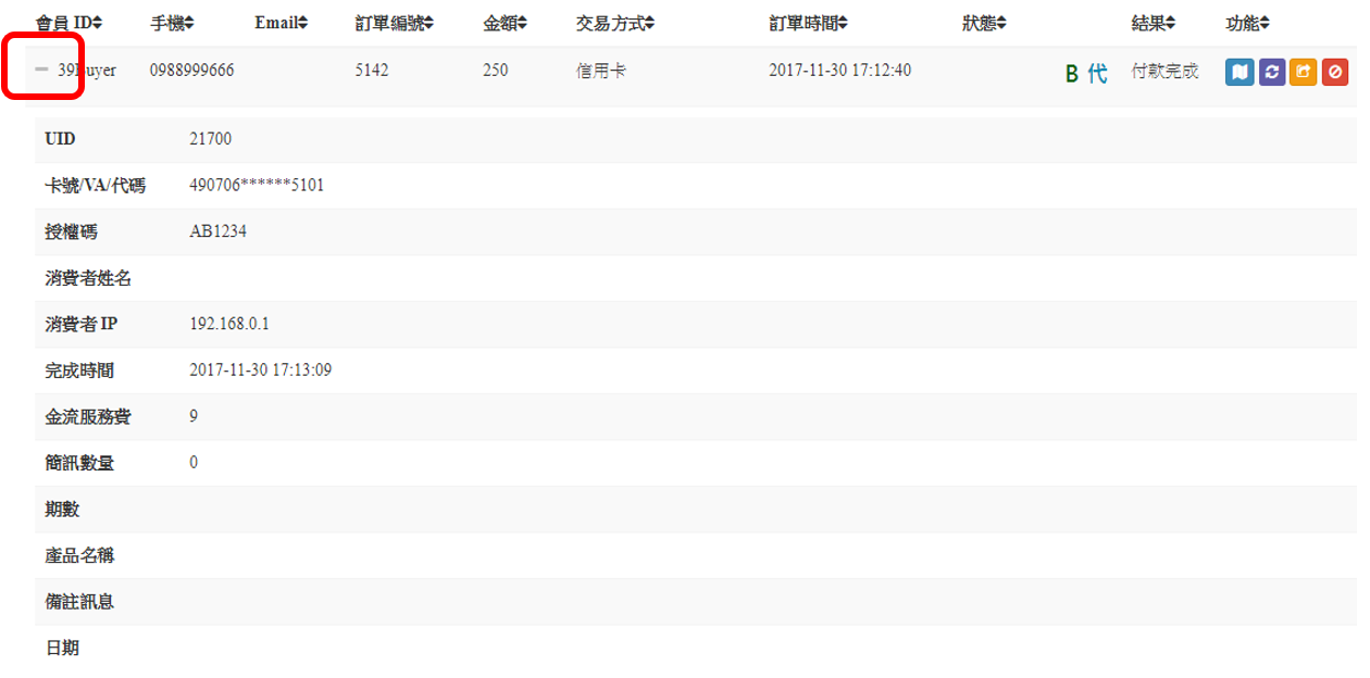 點選訂單前的 "+" 可展開查看該筆訂單詳細的資料;再點 "-" 可隱藏該筆訂單內容。
