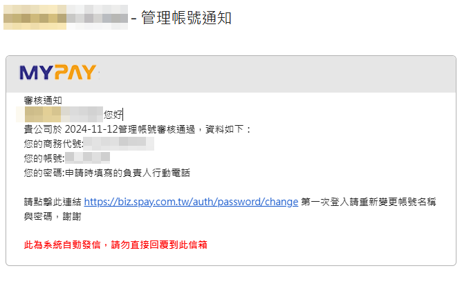 服務申請審核通過時,在管理帳號通知信件中有商務代號,和預設的登入帳號、密碼資料。 【商務代號】 公司行號:統一編號+0001,共12碼。 個人身分:身份證字號+0001,共14碼。 【登入帳號】 若您不確定有沒有變更過帳號名稱,可先測試使用預設的登入帳號: 公司行號:預設為統一編號。 個人身分:預設為身份證字號。 若預設帳號已無法登入的話,請加入官方 LINE: @mypay,與客服聯繫。 【密碼】 若您不確定有沒有變更過密碼,可先測試使用預設的密碼: 公司行號:預設為負責人的手機號碼。 個人身分:預設為申請人的手機號碼。…